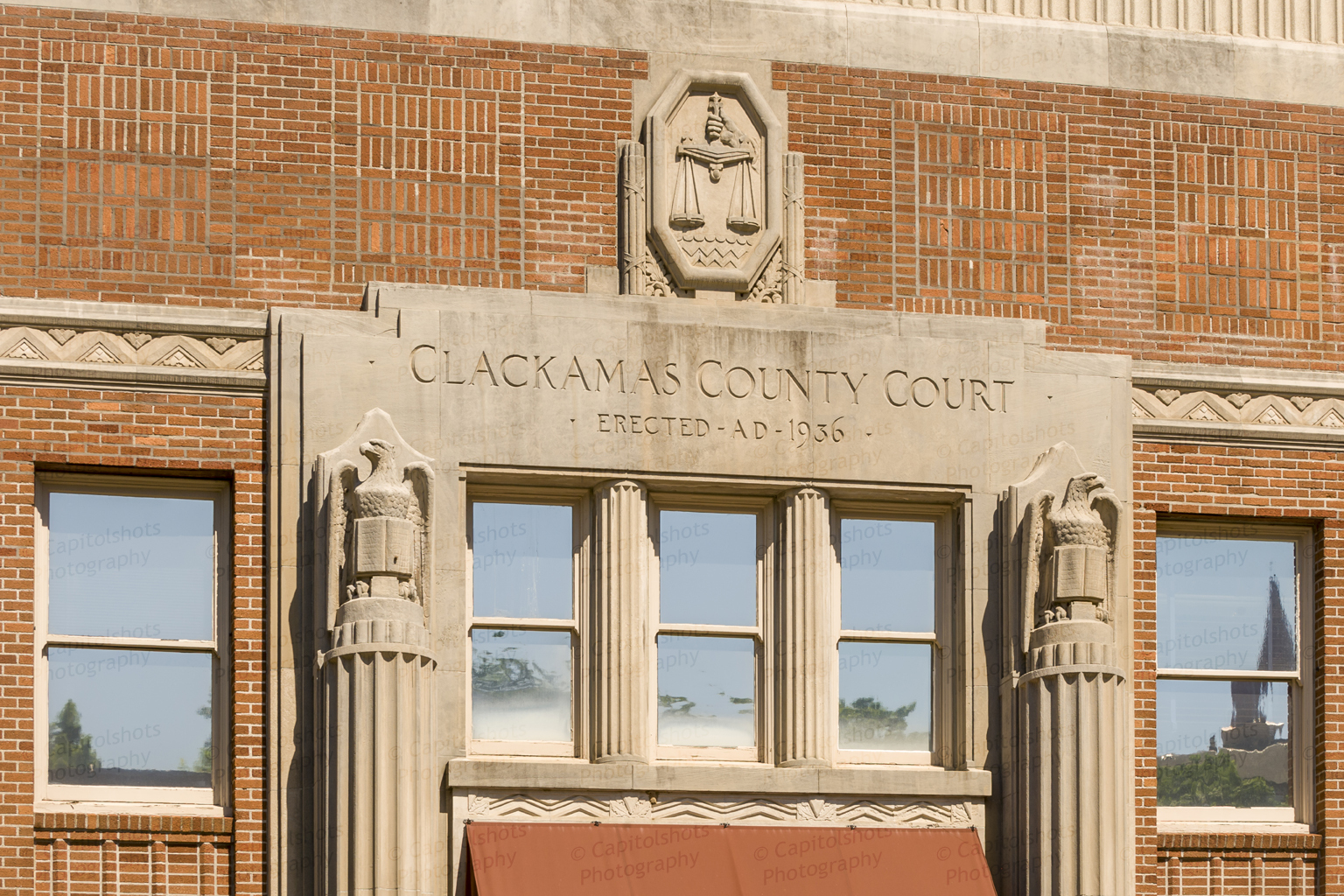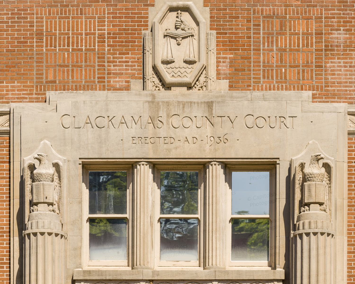 Photos of the historic Clackamas County Courthouse in Oregon City, Oregon. The Oregon City courthouse was designed by Francis Marion Stokes. The brick historic Clackamas County Courthouse, an Art Deco structure, was completed in 1937.